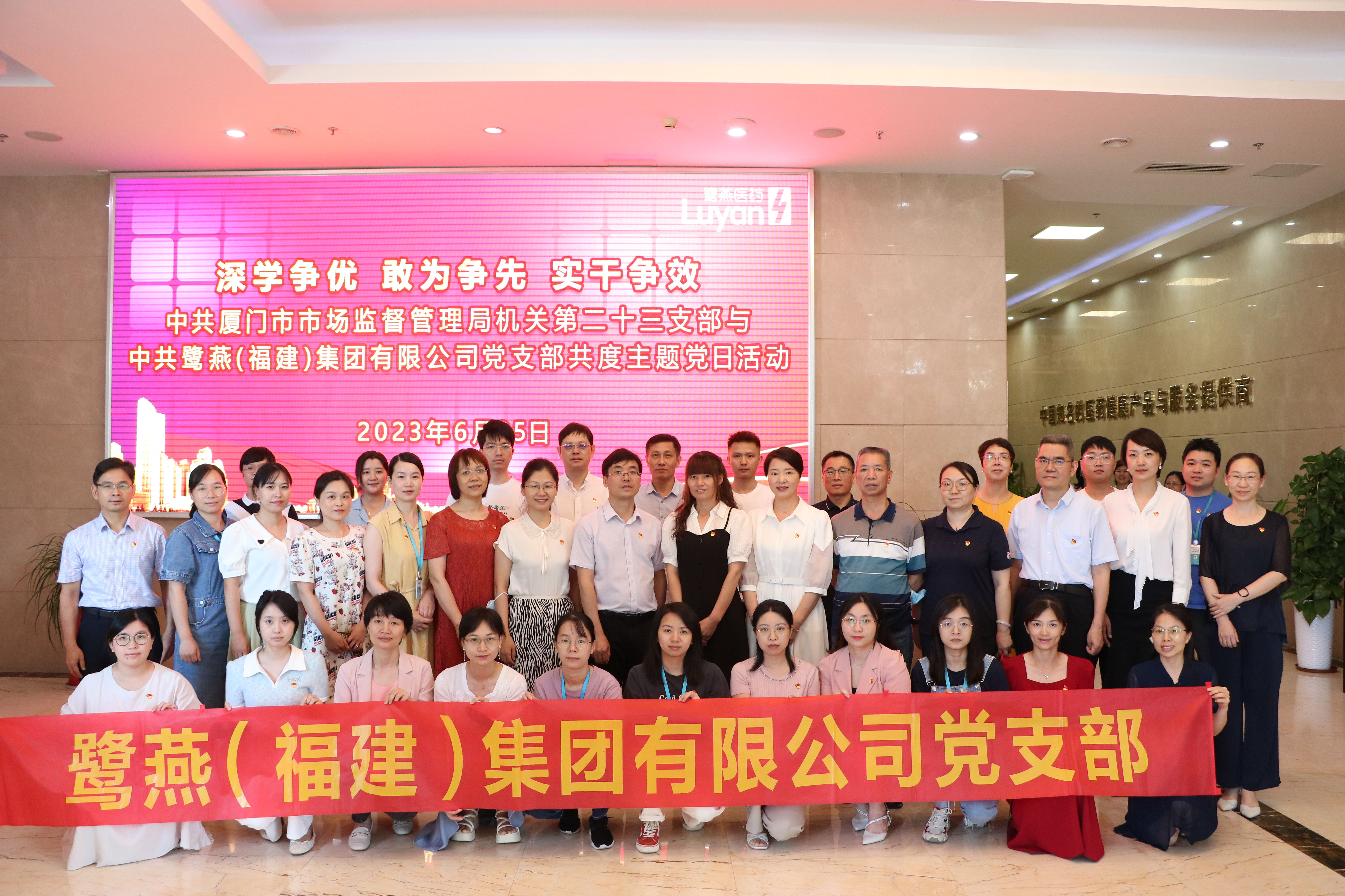 為深入學(xué)習(xí)貫徹黨的二十大精神,慶祝中國共產(chǎn)黨成立102周年,充分發(fā)揮黨建工作對(duì)企業(yè)經(jīng)營管理的引領(lǐng)力,鷺燕(福建)集團(tuán)有限公司黨支部積極主動(dòng)對(duì)接監(jiān)管部門基層黨支部,與中共廈門市市場(chǎng)監(jiān)督管理局機(jī)關(guān)第二十三支部共同開展主題黨日活動(dòng)。2023 年6月25日, 活動(dòng)在鷺燕總部大廈如期舉行,中共廈門市市場(chǎng)監(jiān)督管理局機(jī)關(guān)第二十三支部全體黨員、鷺燕(福建)集團(tuán)有限公司黨支部黨員以及鷺燕集團(tuán)廈門區(qū)域部分成員公司總經(jīng)理、質(zhì)管干部參加了活動(dòng)。