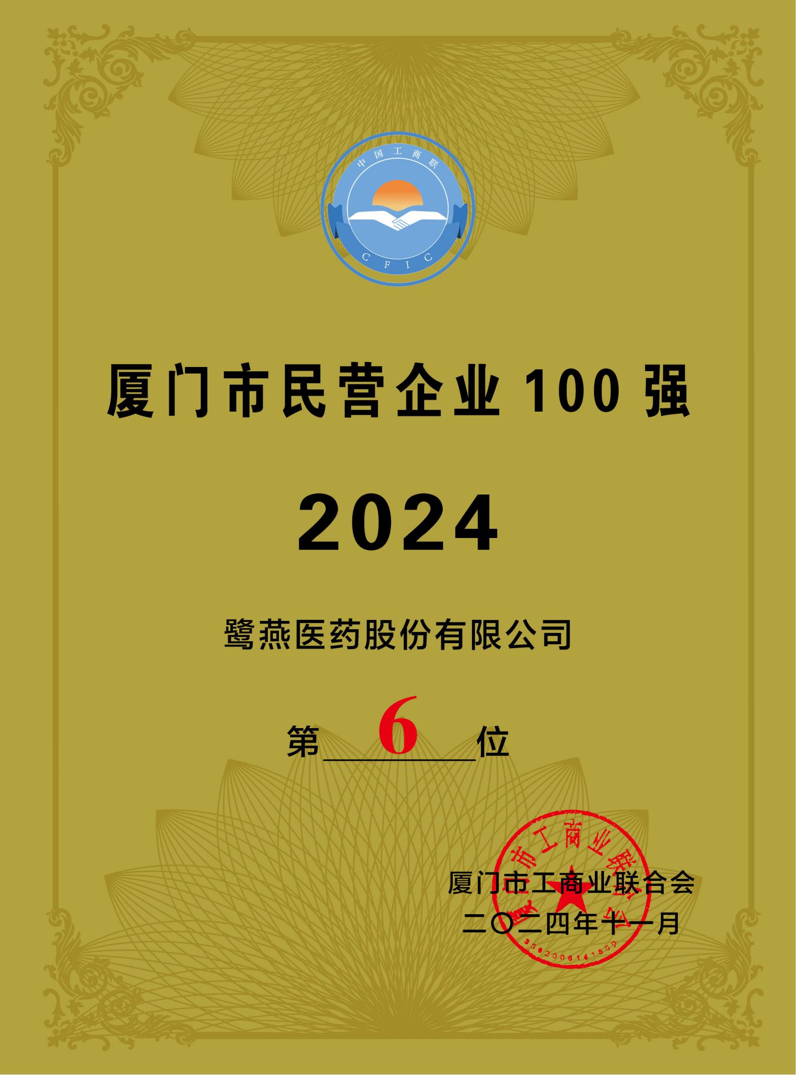 2024年廈門(mén)企業(yè)家日大會(huì)于11月1日召開(kāi),會(huì)上發(fā)布2024廈門(mén)市民營(yíng)企業(yè)100強(qiáng)榜單、2024廈門(mén)市民營(yíng)企業(yè)服務(wù)業(yè)20強(qiáng)榜單。鷺燕醫(yī)藥榮登2024廈門(mén)市民營(yíng)企業(yè)100強(qiáng)榜單第6位,2024廈門(mén)市民營(yíng)企業(yè)服務(wù)業(yè)20強(qiáng)榜單第4位!