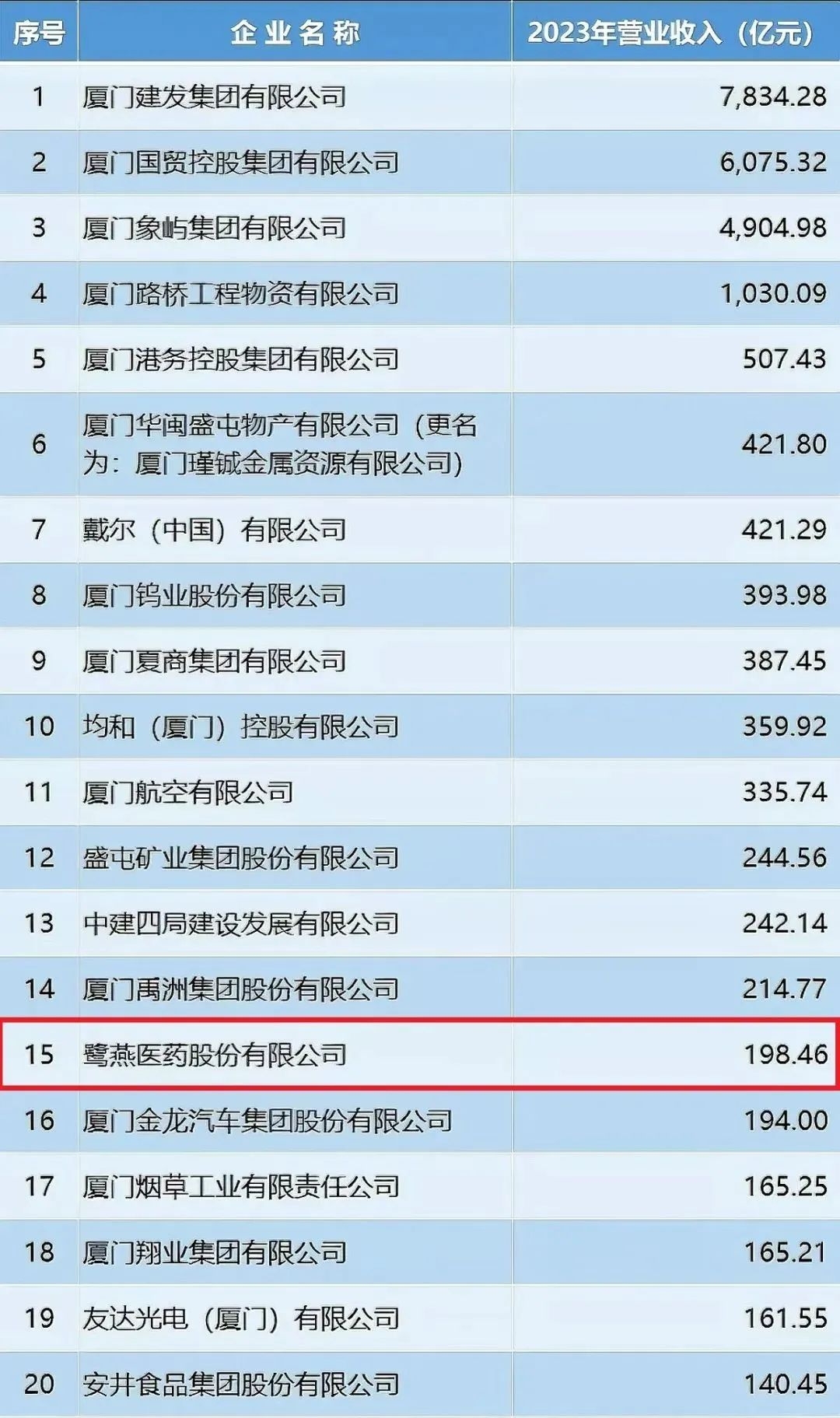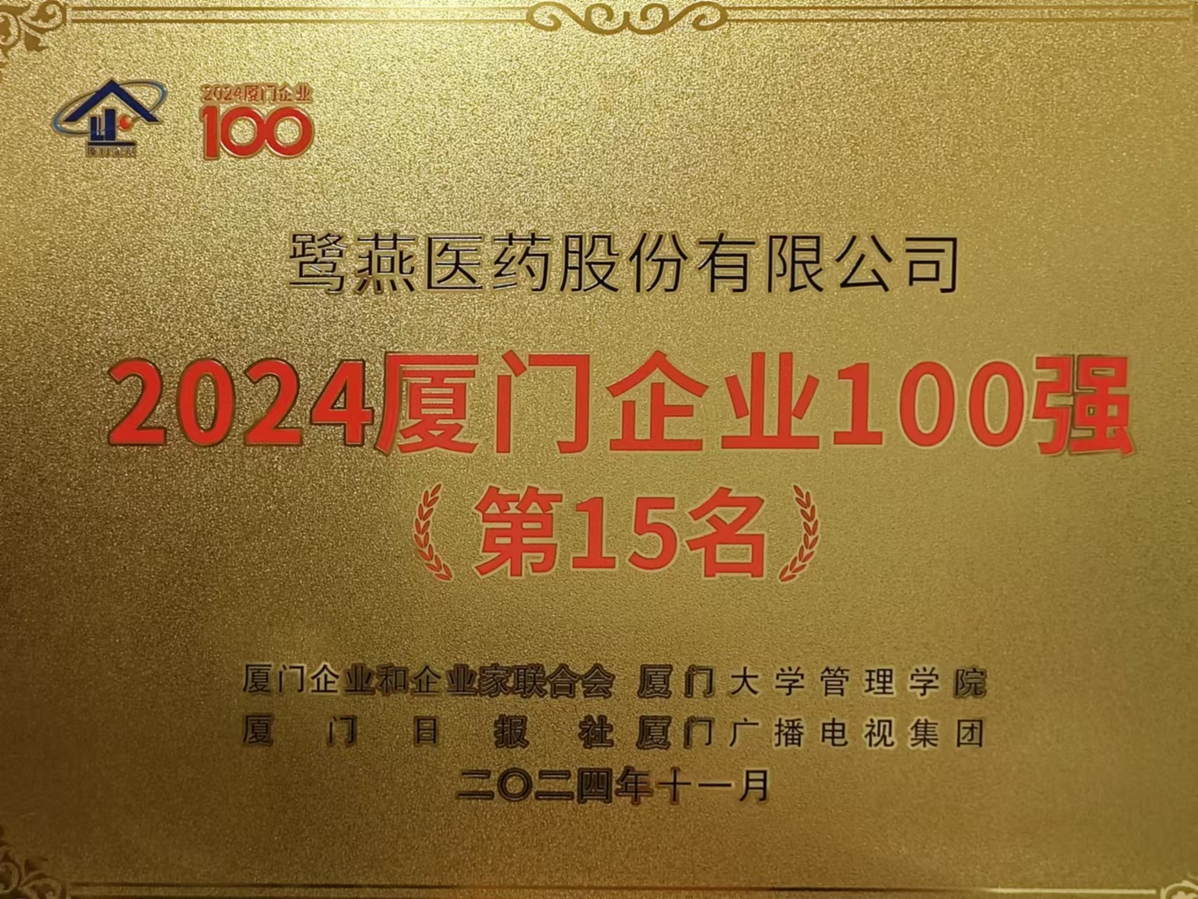 2024年11月,廈門企業(yè)和企業(yè)家聯(lián)合會發(fā)布2024廈門企業(yè)百強榜單,鷺燕醫(yī)藥股份有限公司榮列第15位!